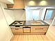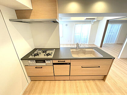 木目調の面材がナチュラルな雰囲気を演出。広々シンクと充実収納で料理も片付けもスムーズ。