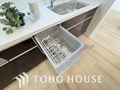 ビルトイン食器洗浄乾燥機付きのシステムキッチン。毎日の家事負担を軽減する嬉しい設備です。