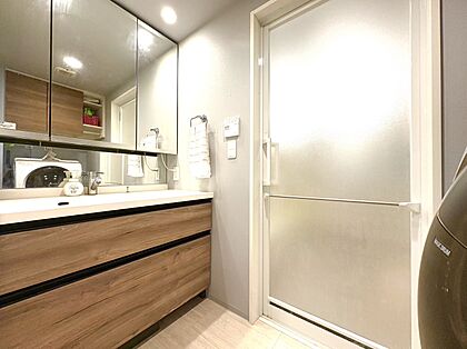 三面鏡つきの洗面所。洗濯機上に収納もあります!
