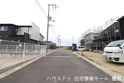 開発分譲地内。前面道路幅は約6mあり、大型車でもスムーズに出し入れできます。(2025年10月10日撮影)