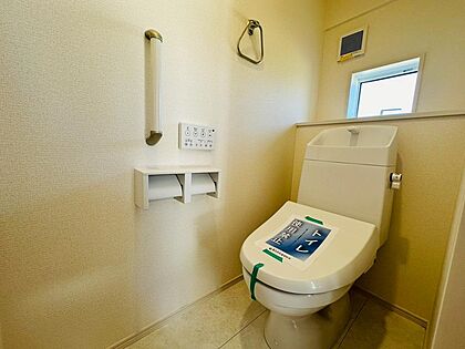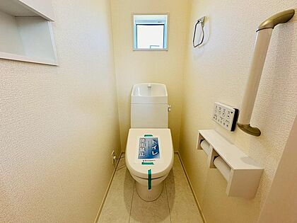 手摺や収納もあるトイレ