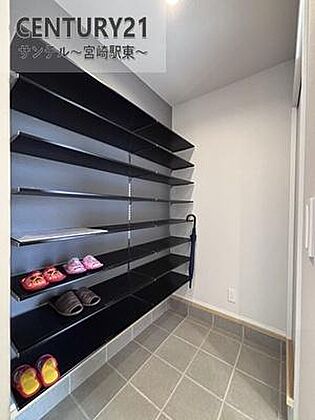 玄関横にシューズクローゼットを設けました。靴や傘はもちろん、ベビーカーやアウトドア用品もすっきり収納。動線が良く玄関が広く見えます。