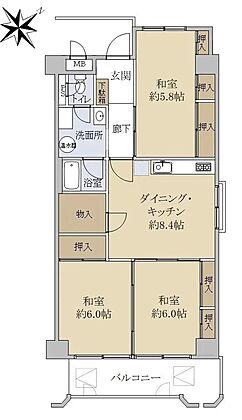 | 間取り | 3DK | 専有面積 | 63.44m2(内法) |