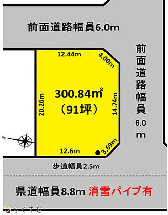 土地面積/坪(坪単価) 300.84m2/91.16坪(6.30万円) 接道