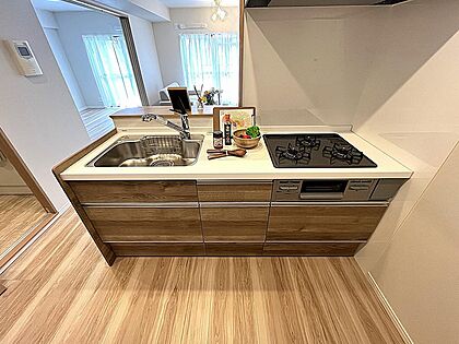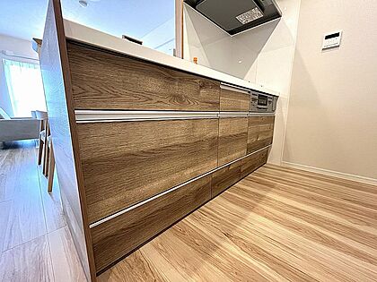 たっぷり収納できる木目調のシステムキッチンで奥様も満足!