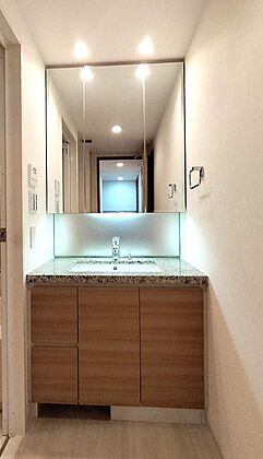 3面鏡にもなる上部収納と下部にも物入を完備された洗面化粧台です。