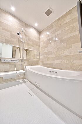 木目調のパネルがやさしい雰囲気を演出するバスルーム。足をのばしてゆったり浸かれる浴槽で、心も体もリラックスできます。