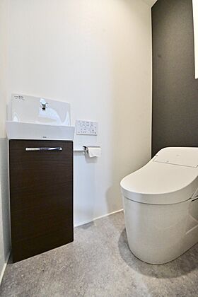 手洗い場付きのタンクレストイレは、見た目もスッキリ。シンプルで機能的な空間に、おしゃれなアクセントクロスが映えます。