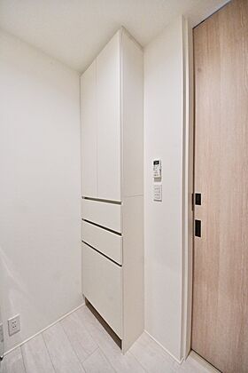 洗面所にも収納あり。しっかり閉まる扉付き収納で清潔感アップ。洗面所内の動線も考えられており、使い心地の良い空間です。