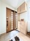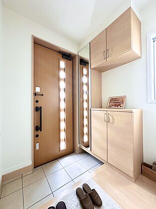 ご家族やゲストを明るく迎える玄関スペース。玄関がスッキリ片付く大容量のシューズボックスや、大きな姿見でおでかけ前の身だしなみチェックもしやすいです。