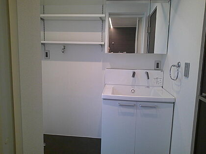 二面の洗面化粧台と洗濯機水栓と収納棚が設置されていて収納たっぷりなっ洗面脱衣所