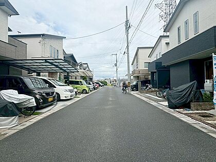 前道が広いことで通路幅に余裕があるため駐車もラクチン♪さらに道路を挟んだ向かいの家との距離が離れるため日当たり・通風も良好!(2025年3月)撮影