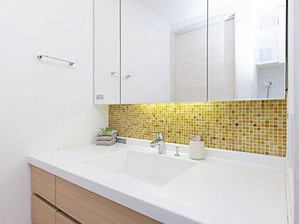 収納を完備した三面鏡の洗面所