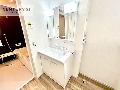 三面鏡仕様の洗面所は、身だしなみがしやすい造り!裏は収納になっています。ドライヤーやお化粧道具を片付けられるので洗面台周りをスッキリと見せることが出来ます!