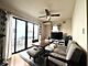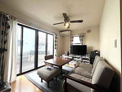 ウッドデッキに繋がる落ち着いた色合いのリビング!シーリングファンがアクセントになって落ち着いた空間を演出します♪