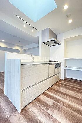 システムキッチン/調理しながらリビングを見渡せる対面式のシステムキッチン、毎日の家事負担を軽減する食器洗浄乾燥機付きです。マンションには珍しい上部にトップライト付きで明るい空間です。