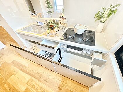 リビングで遊ぶお子様を見守りながらお料理ができる対面キッチン。