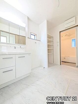 洗面化粧台は収納付きの大きな鏡が付いています♪朝のお忙しい時間帯でも三面鏡の洗面台ならお出かけ前のご準備も手助けしてくれること間違いなし♪