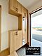 玄関には収納スペースが充実しておりお出かけや帰宅時に便利です。明るい日差しが差し込み開放感を感じる空間です。大きな鏡付きで身だしなみのチェックに役立ちます。木目調のデザインが温かみをプラスしています。