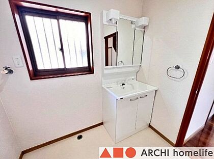 洗面室。ミラー裏と台下に収納あり!水栓はノズルが伸びるシャワー付き!