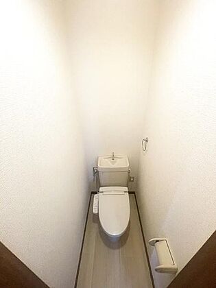 •  シンプルなデザインのトイレです。温水洗浄便座が備わっています。ペーパーホルダーやタオルリングも設置されていて便利です。