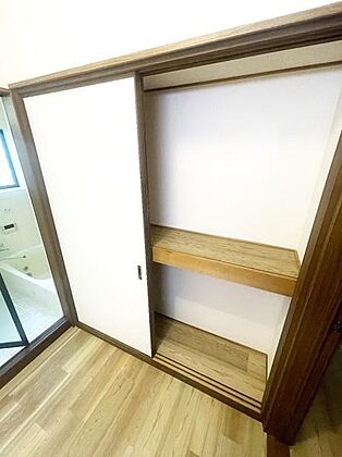 •  収納があり洗面室をすっきりと保てます。さまざまな物の整理に役立ちます。木の棚板が設置されており使いやすさも感じられます。