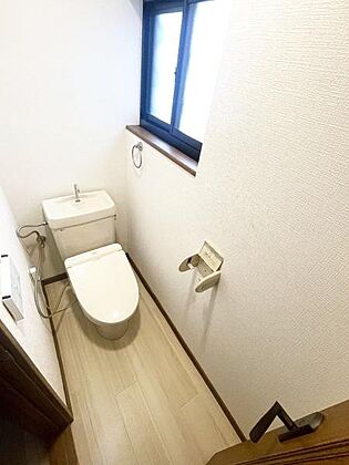•  明るい空間が広がるトイレです。窓があるため換気しやすい設計になっています。温水洗浄便座を備えています。ナチュラルなフローリングが清潔感を演出しています。