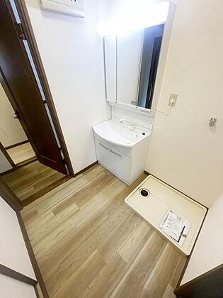 •  鏡と収納スペースを備えており日々の身支度に便利です。明るい照明が備わっており空間がすっきりとした印象です。洗濯機置き場もあり無駄のないレイアウトです。落ち着いた木目調の床が特徴的です。