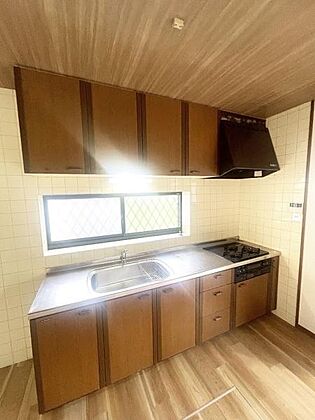 •  上下に豊富な収納スペースが備わっています。窓があり明るい採光が確保されています。ガスコンロとレンジフードが設置されています。
