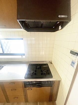 •  窓付きで明るさを感じるキッチンです。三口コンロを備え調理スペースもゆとりがあります。収納も豊富に設置されています。コンロ横には給湯リモコンが配置されています。