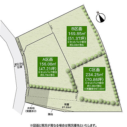 | 土地面積/坪(坪単価) | 156.08m2(登記簿)/47.3坪(69.30万円) | 代表的な接道 | 一方 公道 西 2.6m ※詳細は備考欄をご確認ください |