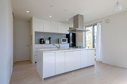 ■キッチン■広々としたアイランドキッチン。大容量収納で生活感が出にくくすっきりお使いいただけます。