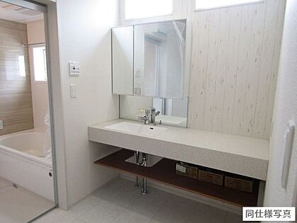 家族みんなが使いやすい、横幅ゆったり設計。タオルや洗剤、ストック類もすっきり収まるオープン収納で、機能的かつスマートな洗面台です。