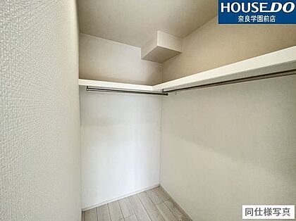 ハンガーパイプの上に棚があり、衣類と小物をすっきり収納可能なウォークインクローゼットです。