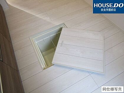 調味料や保存食品、日用品のストックなどをまとめて収納できる床下収納付き。