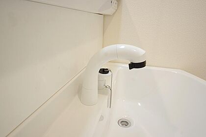洗面台の給水口はホースが伸びるので朝シャン出来ます。シングルレバーでお湯の温度も楽々調整出来ます。