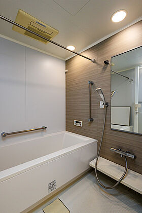 雨の日や花粉、PM2.5対策に重宝する、浴室乾燥機付きの浴室です。一日の疲れを癒してくれる空間です。【浴室】