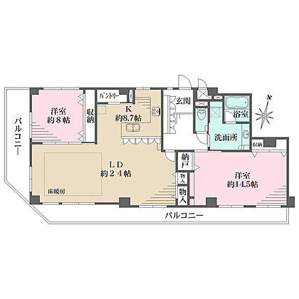 ワイドスパン×2面バルコニー付きで通風良好。LDKは合計約32.7帖。全居室に収納が備わっています。