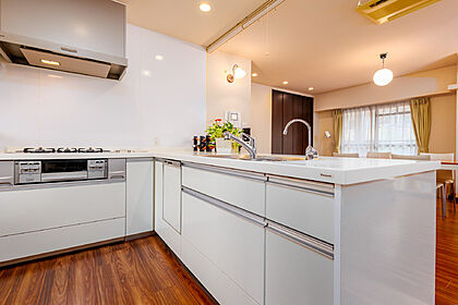 ※販売対象に家具・調度品は含まれません。効率の良いL字型のキッチンが備わっています。対面式のため、会話が弾みそうです。