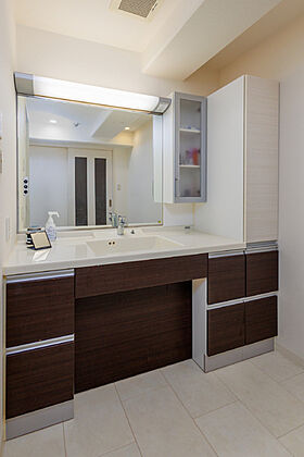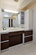 ※販売対象に家具・調度品は含まれません。大きな一面鏡が使いやすい洗面化粧台。サイドやシンク下に収納も充実しています。