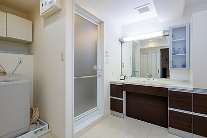 ※販売対象に家具・調度品は含まれません。洗面所が玄関に近く、帰宅後すぐに手が洗え、衛生的。洗面所内に収納も備わっています。
