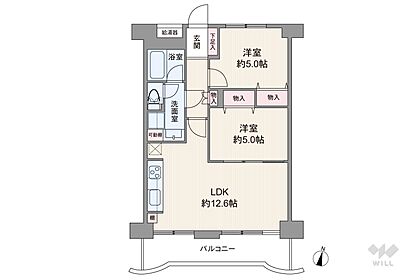 専有面積55.44平米の2LDK。LDKは約12.6帖。各居室に収納スペースあり。南東向きにつき日当たり良好。