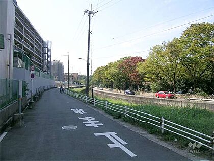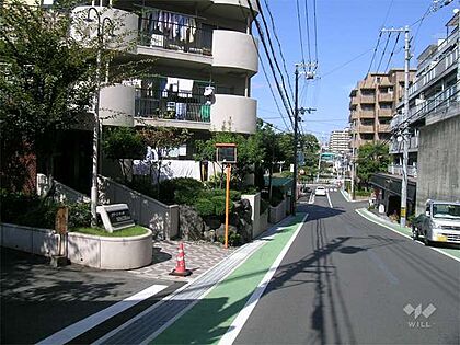 敷地東側の道路(駅に向かって上り坂です)。北大阪急行線「緑地公園」駅徒歩3分。1978年1月築。総戸数75戸の分譲マンションです。
