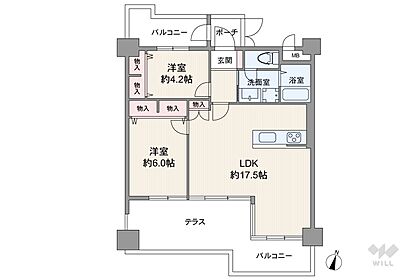 間取りは専有面積60.07平米の2LDK。LDK約17.5帖のプラン。バルコニー面積は24.37平米です。
