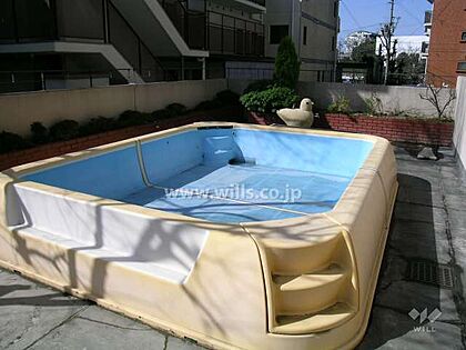敷地内のプール。大阪モノレール線「少路」駅徒歩10分。1985年3月築。総戸数72戸の分譲マンションです。