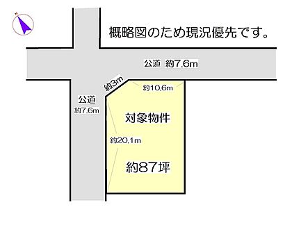 | 土地面積/坪(坪単価) | 288.78m2(登記簿)/87.51坪(42.10万円) | 代表的な接道 | 角地 ※詳細は備考欄をご確認ください |