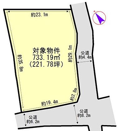 | 土地面積/坪(坪単価) | 733.19m2(登記簿)/222.18坪(13.40万円) | 代表的な接道 | 角地 ※詳細は備考欄をご確認ください |