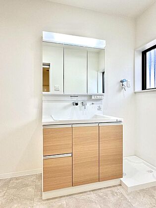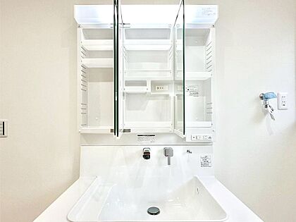 大きく見やすい三面鏡で清潔感ある洗面台は、身だしなみチェックや肌のお手入れにおすすめです。