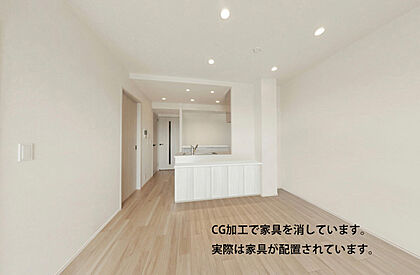 アウトフレーム工法でスッキリとした家具の配置が可能なリビングダイニングです。