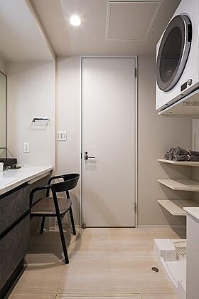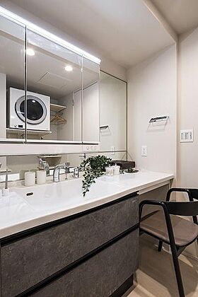 洗面化粧室/メイクスペースを確保したホテルライクな洗面化粧台、収納スペースも豊富でかさばる小物類をすっきりと収納します。